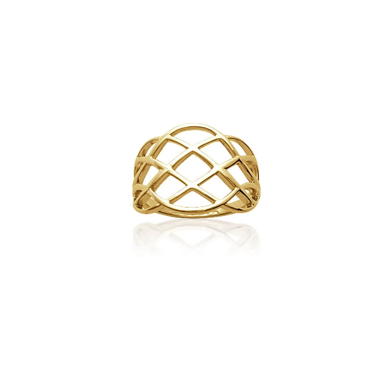 Cette bague en plaqué or 750‰ séduit par sa forme bombée et incurvée, travaillée en ajours de croisillons géométriques qui laissent respirer la matière et apportent légèreté visuelle.