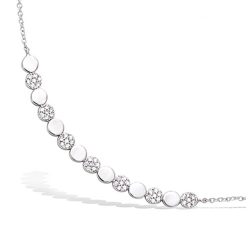 Gourmette fine et très élégante montée sur une maille forçat avec une suite de petites pastilles plaqué or brillantes et rondes de Ø différent.