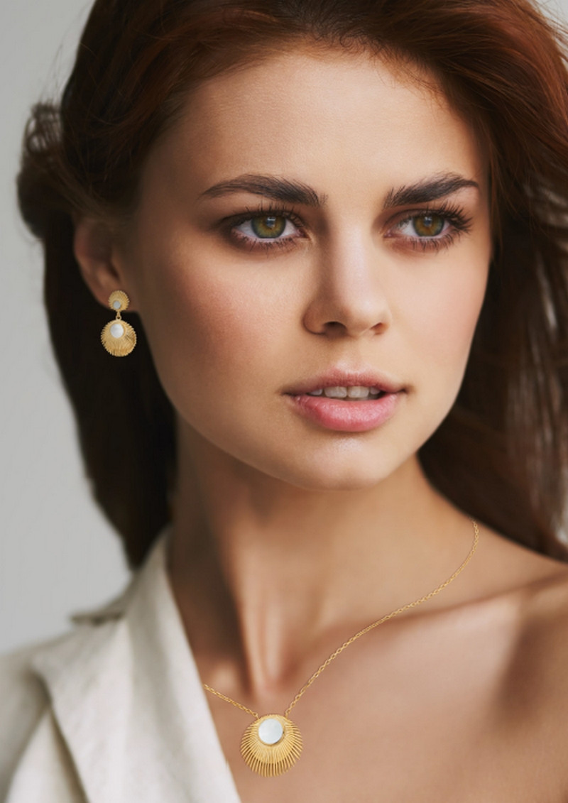 Collier très lumineux avec son pendentif plat représentant des rayons de soleil, très design & impression 3D, avec à son centre un pastille de nacre blanche.