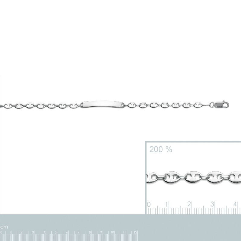 Bracelet identité en argent massif 925 ‰, maille double gourmette lâche, plaque rectangulaire 5 mm. Longueur ajustable jusqu’à 18 cm (réglable dès 14 cm). Gravure recto et/ou verso possible.